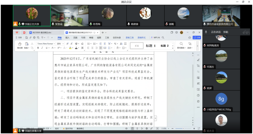 12月1日晚上,广东省机械行业协会以线上会议方式组织并主持了由惠州市诚业家具有限公司、广东网纳智能装备有限公司完成的“金属家具侧封箱包装柔性生产线关键技术研发与产业化” 项目科技成果鉴定会。